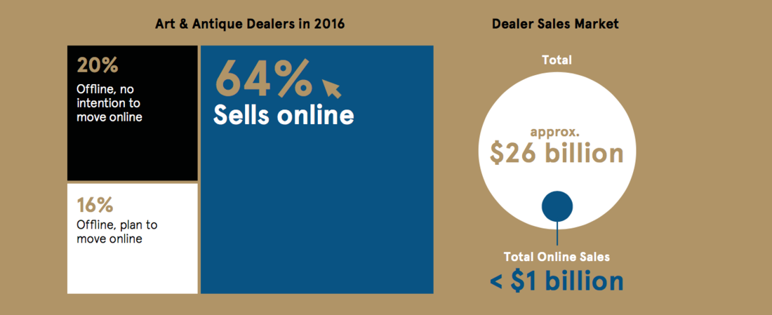 Os dealers, em contrapartida, estão demorando a se adaptaras às novas tecnologias, com apenas um terço das operações realizadas online e com 20% das galerias e marchands afirmando que não têm intenção de migrar para a internet. Embora o mercado para venda de antiguidades online seja pequeno, o relatório apontou 18,8% de crescimento, o que significa que apesar do baixo engajamento, as vendas online estão em expansão.