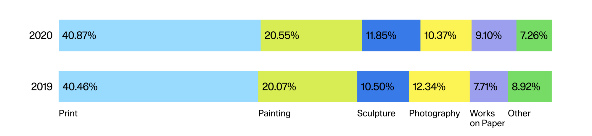 Em relação às mídias, o meio que teve o melhor desempenho em termos de compras feitas na plataforma foi a gravura. As impressões representaram 40,9% de todas as compras no site em 2020, quase exatamente a mesma participação de 2019. As compras de impressões através da plataforma aumentaram 24,5% de 2019 a 2020.
