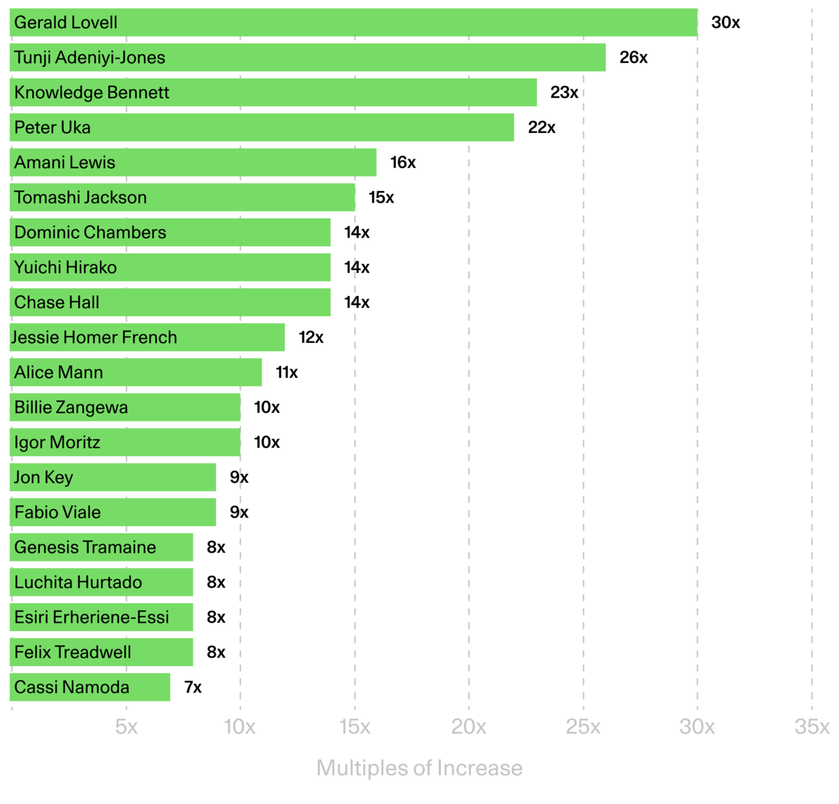 Dos 20 artistas mais pesquisados na plataforma em 2020, 19 são homens. A única mulher da lista, Yayoi Kusama, viu o número de usuários perguntando sobre seu trabalho aumentar 20,1%. Apesar disso, ela caiu uma posição, de 13º para 14º lugar. Essa mudança foi devido a um aumento na demanda por obras de Daniel Arsham, artista conhecido por suas esculturas futurísticas de objetos familiares representados como fósseis incrustados de cristal.