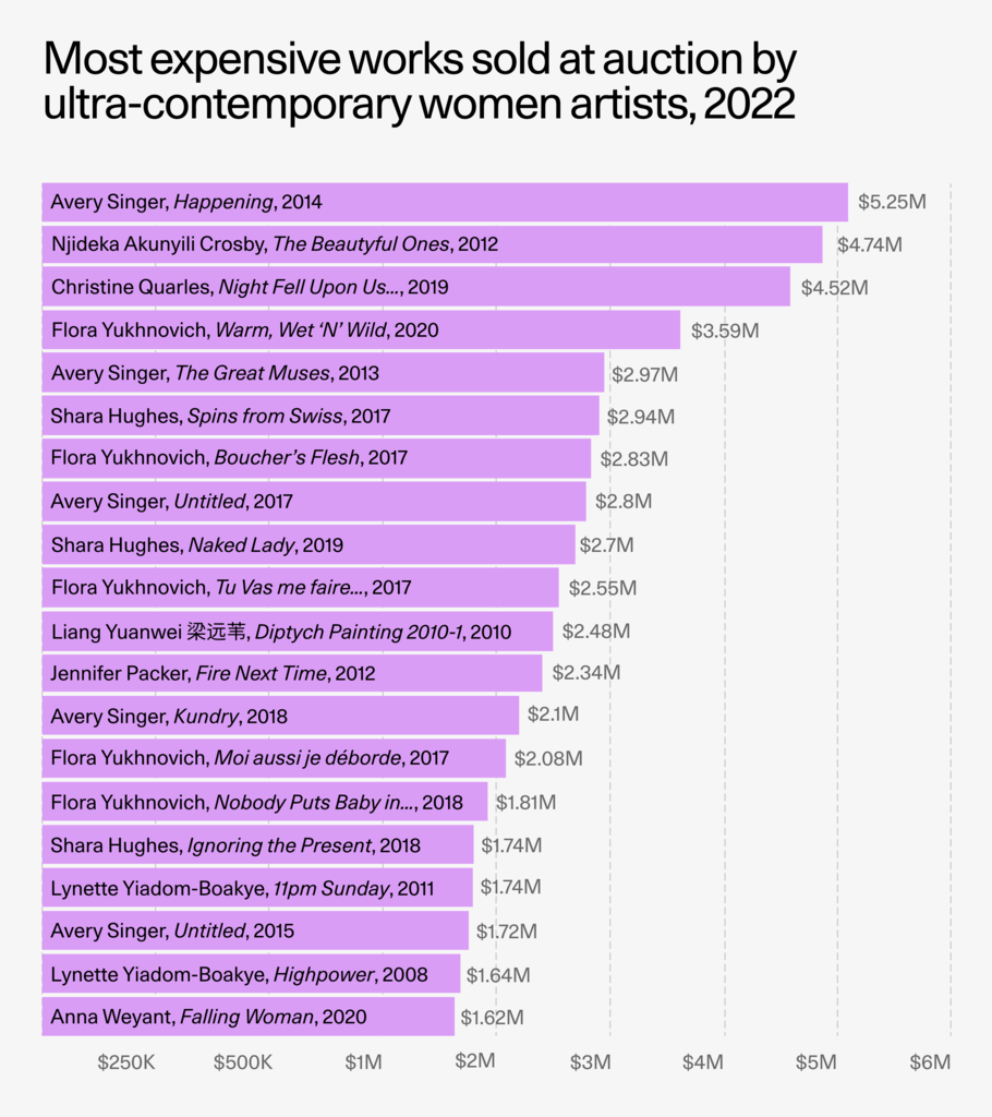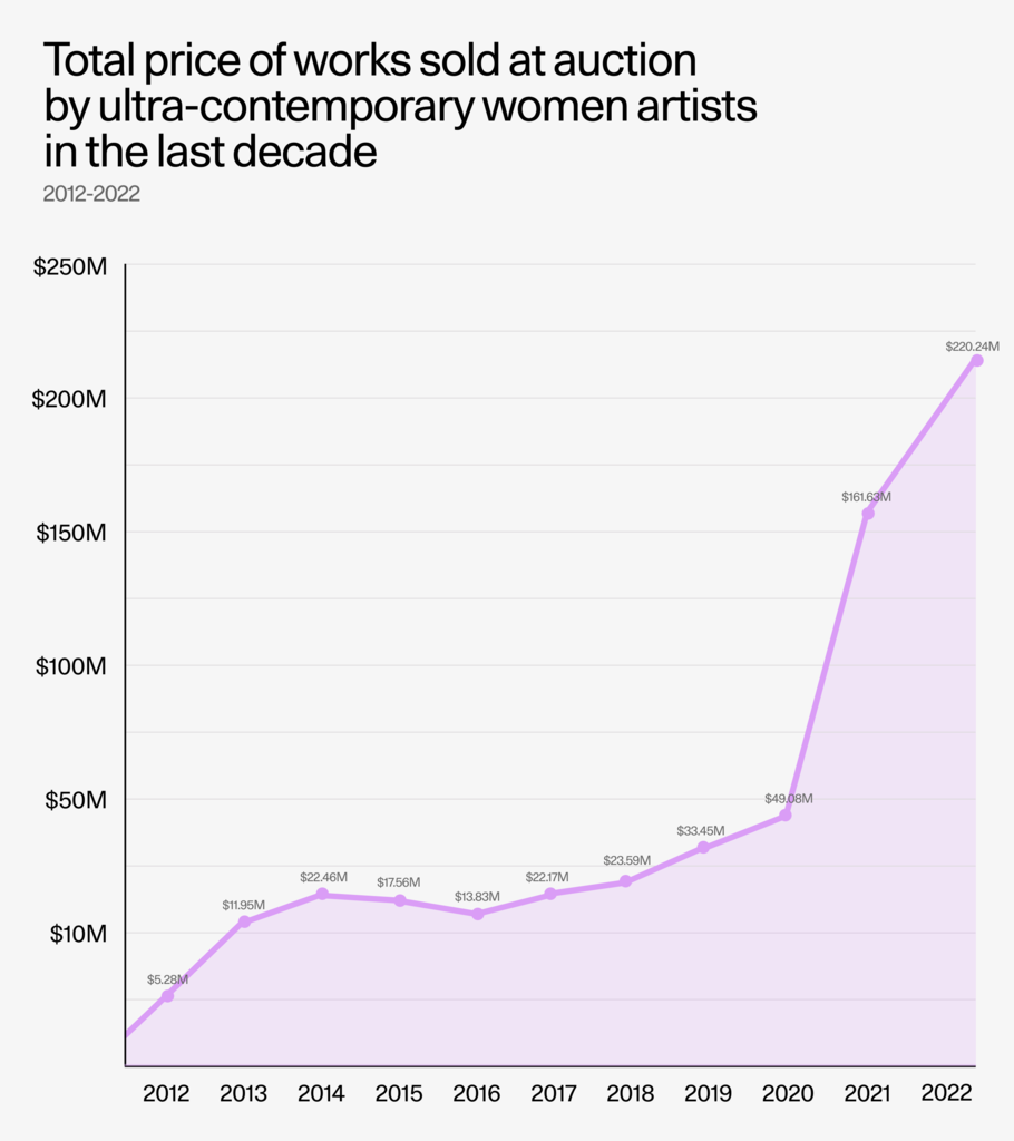 Embora estejamos vendo muitos artistas com muito menos de 37 anos vendo suas obras irem a leilão no momento, esse dificilmente era o caso uma década atrás, e a empolgação por obras de artistas mais jovens cresceu significativamente nos últimos três anos. Talvez uma melhor medida do crescimento recente do mercado ultracontemporâneo para o trabalho de mulheres artistas em seu estado mais maduro possa ser vista através do aumento de 349% ocorrido entre 2020 e 2022.