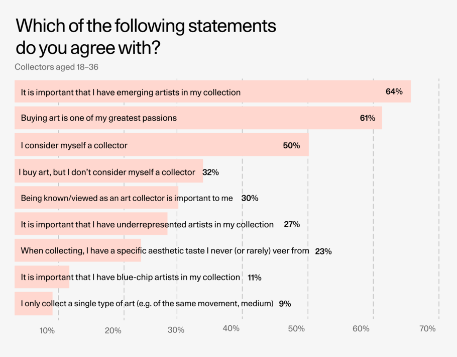 Também foram encontradas diferenças geracionais notáveis entre colecionadores mais jovens e mais velhos, particularmente em termos dos tipos de arte que os atraem e como os compram. Colecionadores da geração Y e da geração Z são, sem surpresa, mais engajados digitalmente do que seus colegas mais velhos. Mas eles também são motivados por fatores diferentes e colecionam de maneiras evidentemente diferentes.
