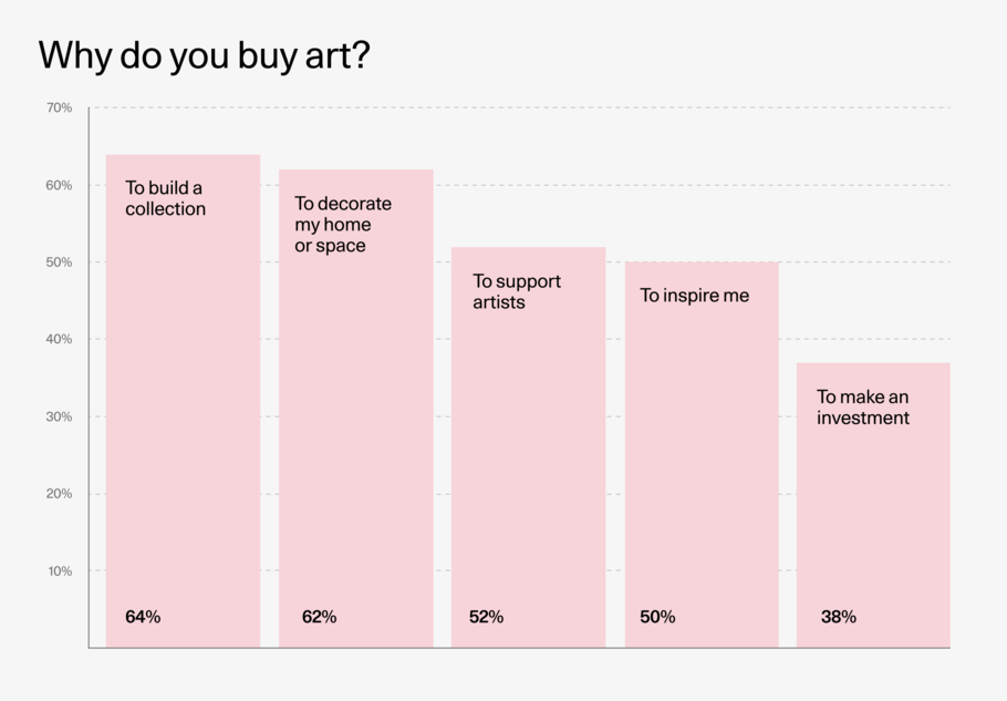 Quando questionados sobre o motivo pelo qual compram arte, a maioria dos entrevistados disse que pretende construir uma coleção (64%), seguida do desejo de decorar casas ou outros espaços (62%), de apoiar artistas (52%) e de encontrar inspiração ( 50%).