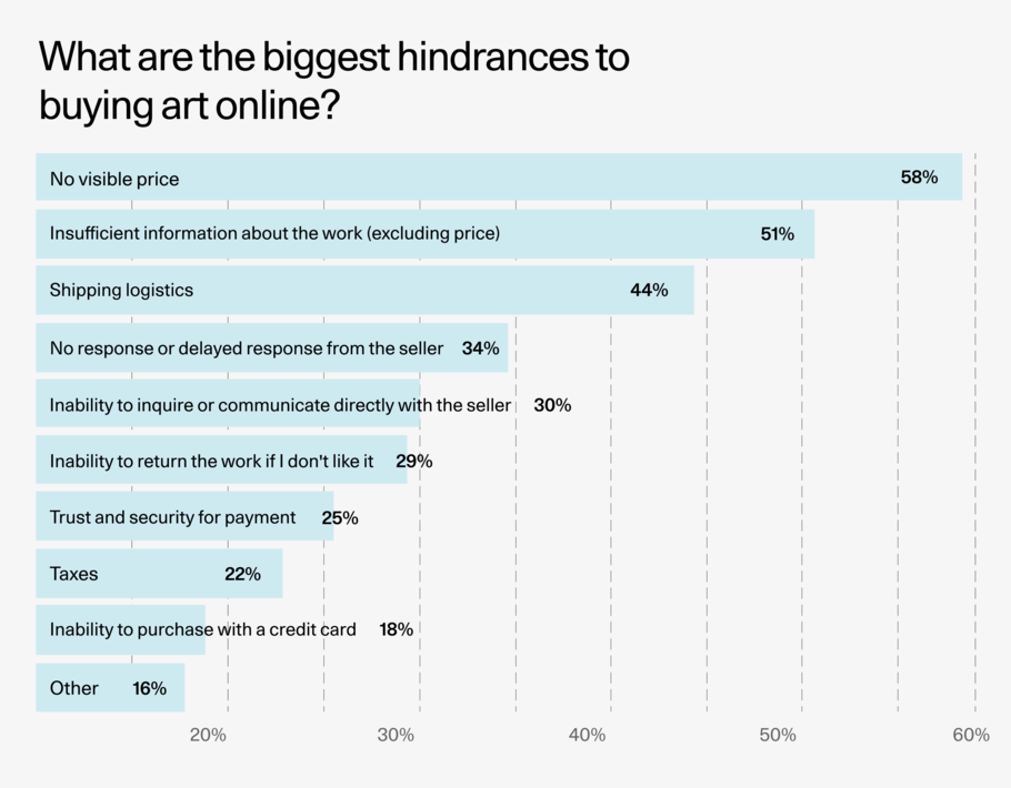 Quando se trata de comprar arte online, os entrevistados priorizam a segurança e a transparência. A maioria (58%) identificou a falta de transparência nos preços como o principal fator que os impede de comprar arte online.