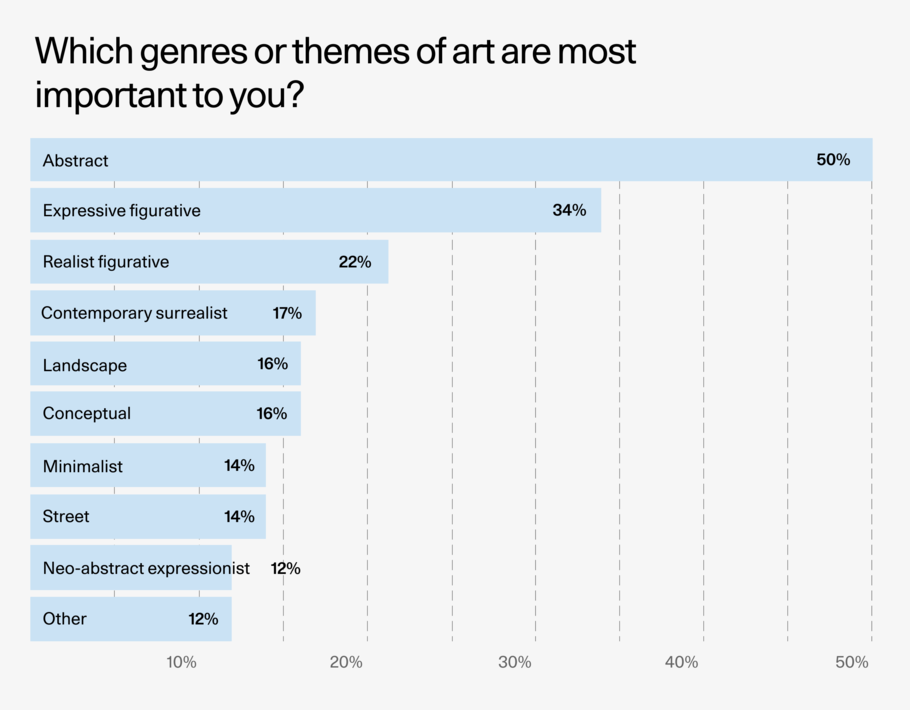 Quando se trata de gêneros artísticos, os colecionadores gravitam em torno de vários deles associados à pintura. Questionados sobre quais são os três gêneros de arte contemporânea mais importantes para eles, os colecionadores selecionaram a arte abstrata (50%), seguida por obras figurativas expressivas (34%), obras figurativas realistas (22%) e surrealismo contemporâneo (17%).