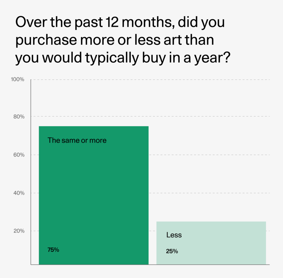 Em geral, a grande maioria dos colecionadores entrevistados comprou a mesma quantidade de arte ou mais que no ano passado, mantendo a constância na utilização das ferramentas online para comprar e descobrir arte, mesmo na pós-pandemia.