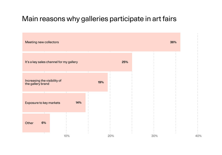 Não é, portanto, um choque ver que, entre as galerias entrevistadas que participam em feiras de arte, grande parte (36%) apontou “conhecer novos colecionadores” acima de qualquer outra opção quando questionados sobre as razões. Cerca de 75% dos que participaram de feiras de arte no ano passado afirmaram que conquistaram novos clientes com isso.