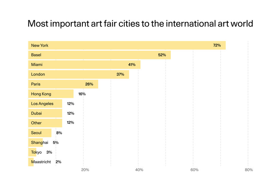 Quando questionados sobre quais cidades com grandes feiras de arte são mais importantes para o mundo da arte internacional, esta combinação vem à tona. Nova York foi identificada pela maioria dos entrevistados (75%) como uma das cidades com feiras de arte mais importantes no mundo da arte internacional pelos entrevistados.