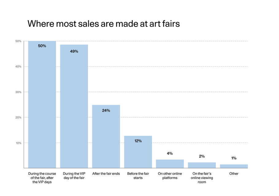 Quando solicitados a selecionar os dois períodos de uma feira de arte que geram mais vendas, a maioria dos entrevistados (50%) disse que a maior parte das vendas é feita durante a feira, após o dia VIP. No entanto, quase o mesmo número (49%) disse que realiza a maior parte das vendas no dia VIP. Enquanto isso, quase um quarto (24%) afirmou que a maior parte das suas obras é vendida após o final da feira.