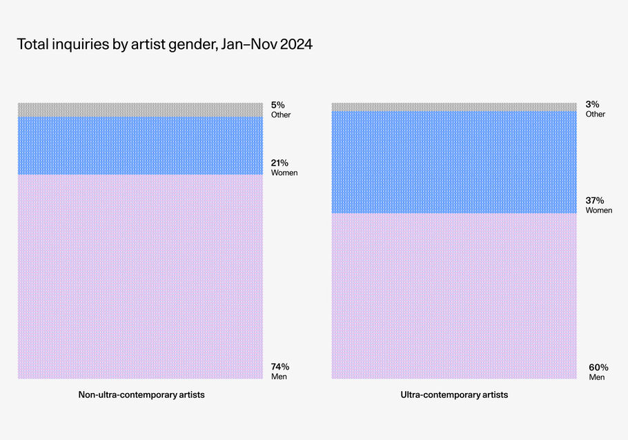 Os dados coletados do mercado primário para este relatório demonstram que cerca de 29% das consultas no Artsy em geral em 2024 foram para obras de artistas mulheres. Mas, embora esse número ainda esteja longe da paridade de mercado, ele mostra um crescimento notável nos últimos cinco anos: em 2019, o número ficou em 17%.