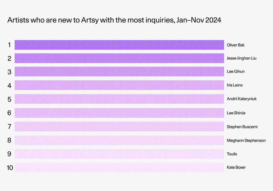Este gráfico analisa os artistas que foram adicionados à plataforma Artsy desde novembro de 2023, classificados pelo número de consultas que seus trabalhos receberam de janeiro a novembro deste ano. Enquanto alguns estão nos estágios iniciais de suas carreiras, outros já estão construindo um momento impressionante no portal, alcançando novos públicos por meio de canais online.
