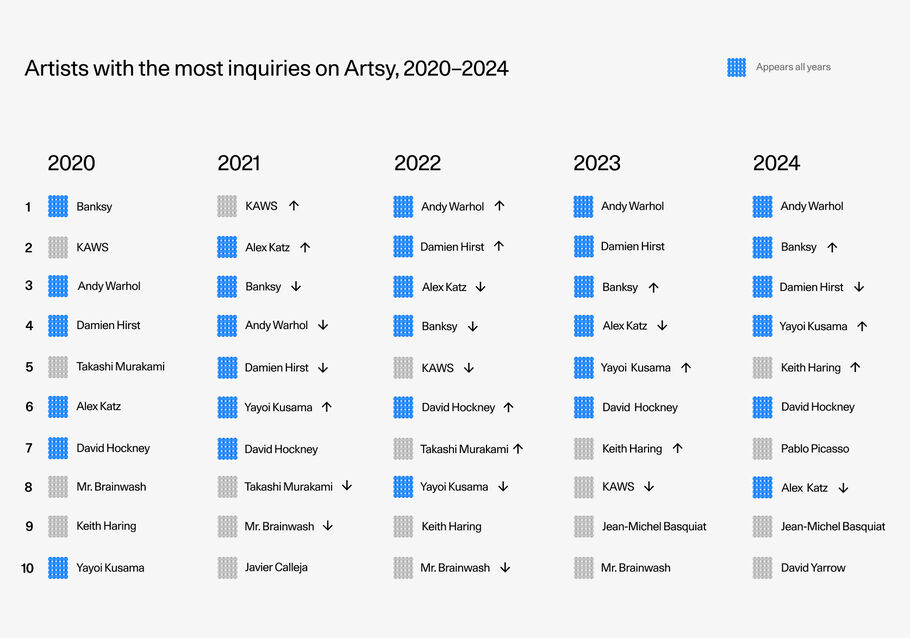 O gráfico mostra os 10 principais artistas dos últimos cinco anos e destaca os nomes que aparecem na lista em todos os cinco anos. Enquanto 11 nomes aparecem em listas de vários anos, seis aparecem todos os anos: Andy Warhol, Banksy, Damien Hirst, Yayoi Kusama, David Hockney e Alex Katz. Essa consistência na demanda é um indicador dos artistas com mercados relativamente estáveis, mesmo em momentos de incerteza econômica.